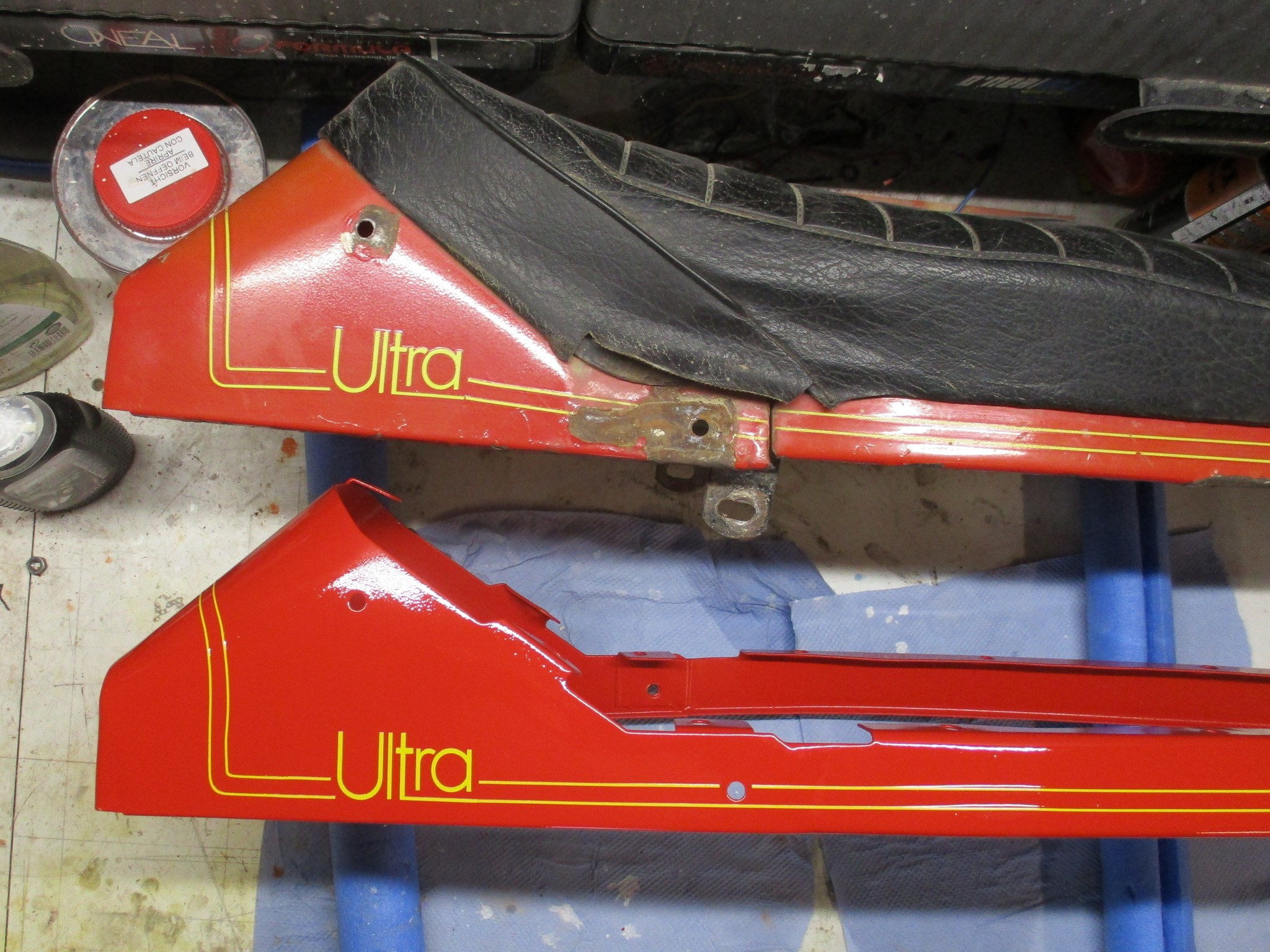 Hier mal ein Vergleich zu der originalen Sitzbankverkleidung. Man sieht, dass damals auch nicht so sehr genau gearbeitet wurde: