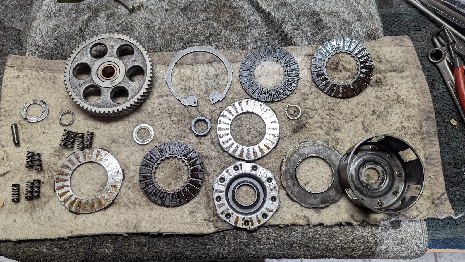 Total verschmutzt, Kurbelgehäuse vergammelt. Positiv: keine Ausbrüche. Dann mal zerlegt und alles bewertet, zuerst der Kupplungsdeckel.
