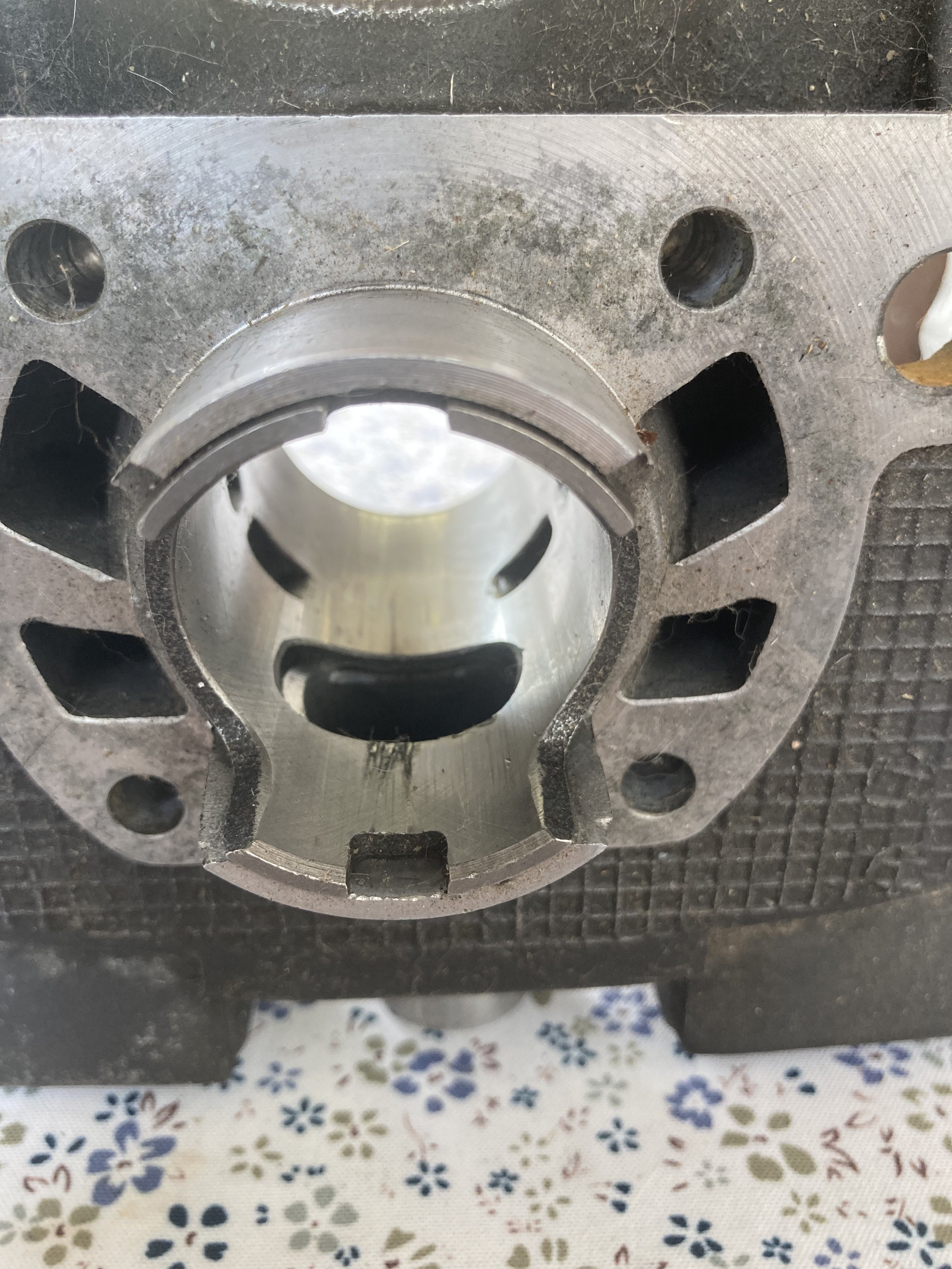 2.Einmal den Zylinder mit Honbürste kurz säubern und schauen wie tief die Riefen am großen Kanal unterhalb sind.Oberhalb sehe ich nichts schlimmes.